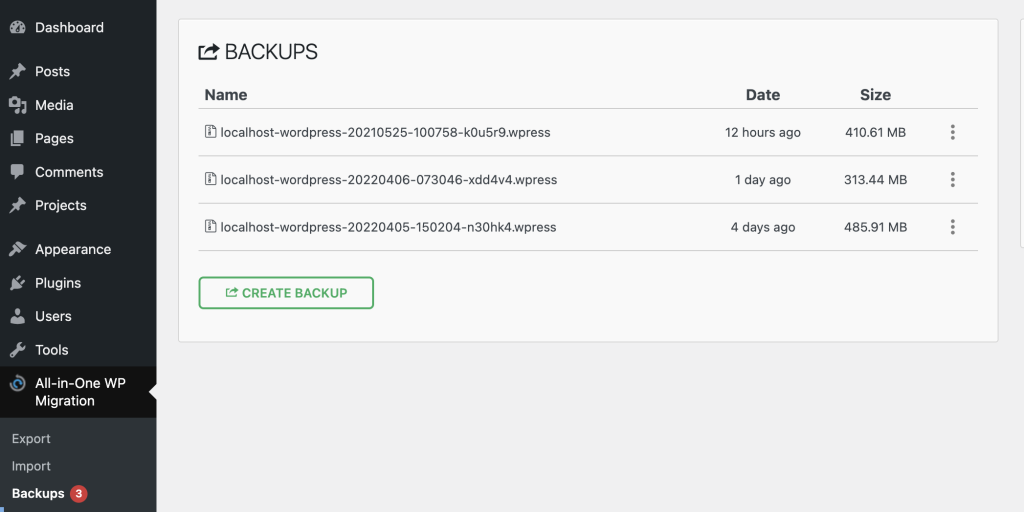Creating a backup and keeping it inside this folder initializes when choosing option ‘File’ from the Export menu, described in Step 2 of this guide. You can also copy and paste backups inside ‘ai1wm-backups’ folder via a local file manager or FTP/SFTP application. This page will then also list it. Please note that if you put files with extensions besides ‘.wpress’, they will not appear on the list.