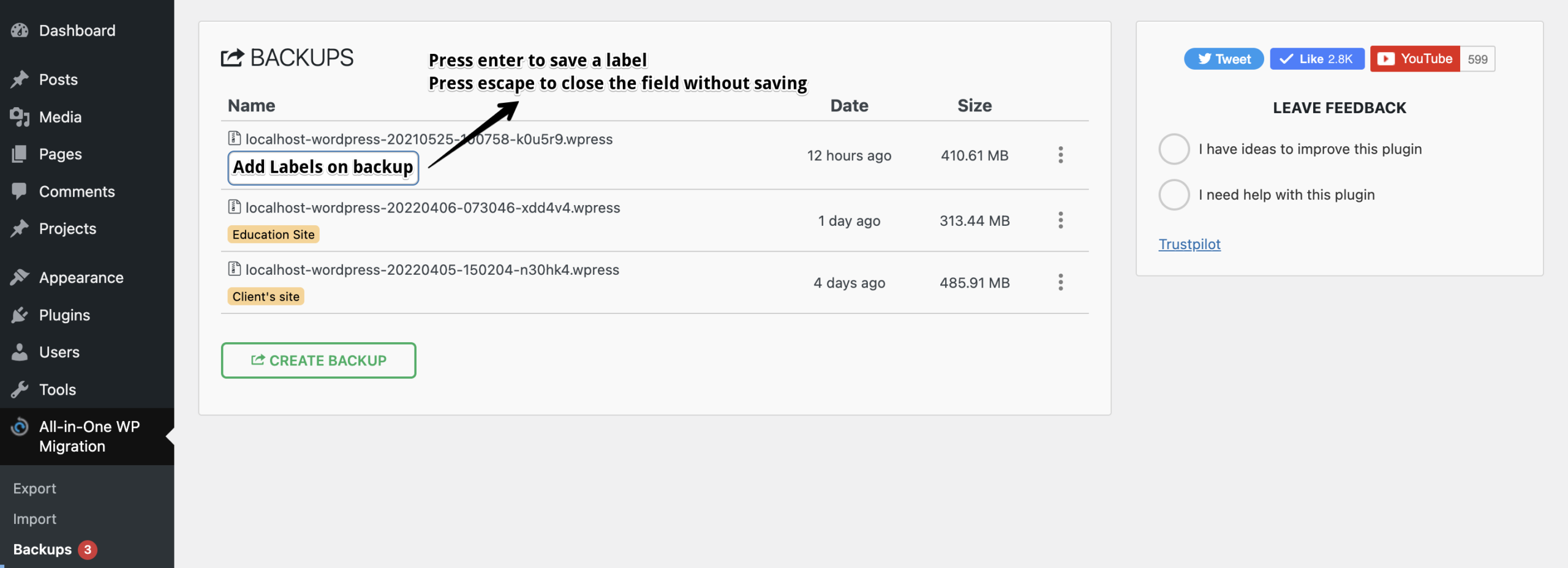 1. All-in-One WP Migration Backups Page