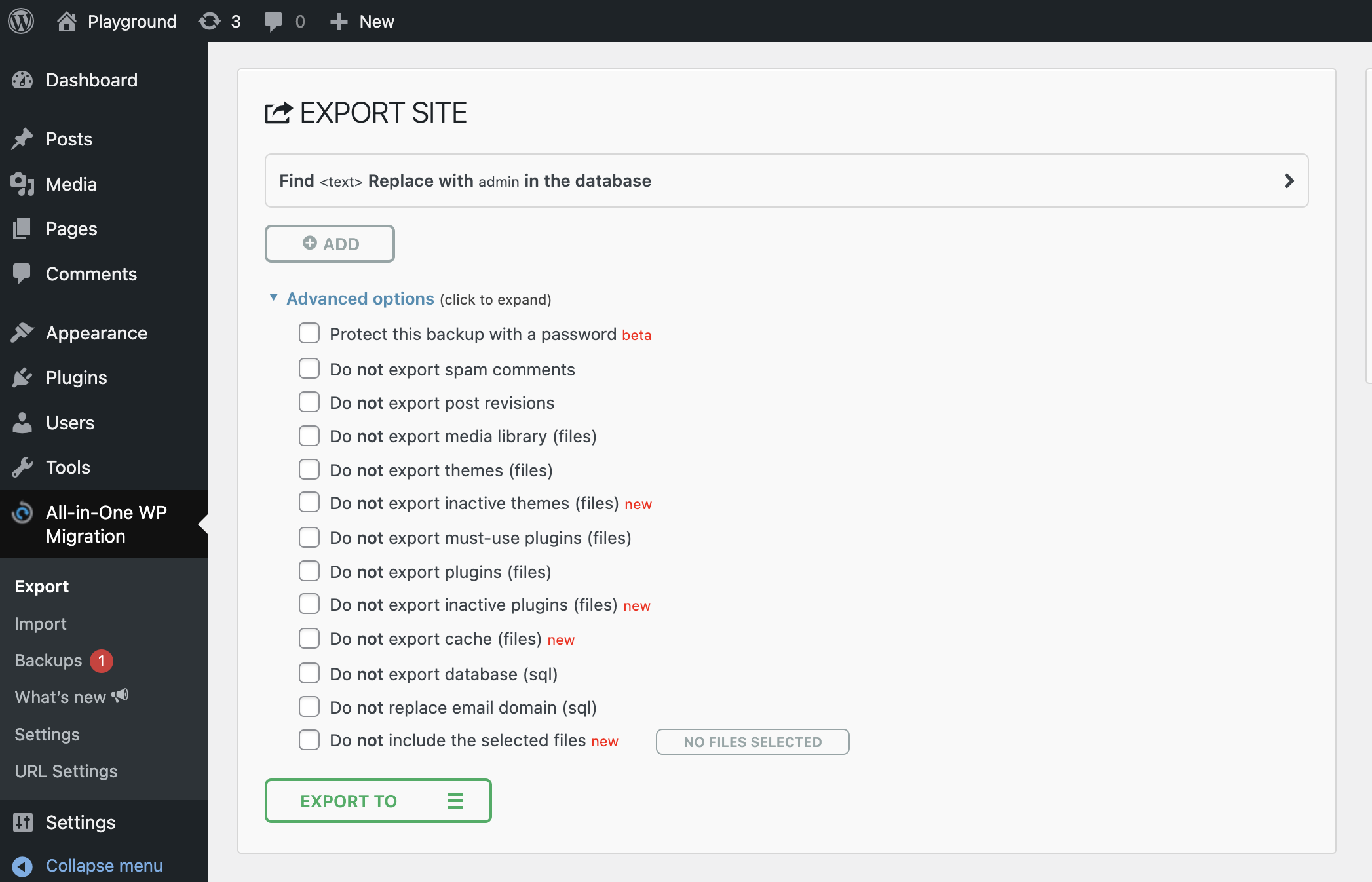 All options available from the dropdown menu, except “File” should be used with a combination of All-in-One WP Migration plugin with a corresponding extension installed. For more information about available extensions please visit: https://servmask.com/products.