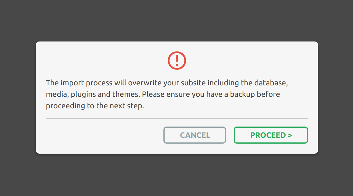 The import includes an additional step that warns you that the new backup will overwrite your website’s database, media, plugins, and themes. This is the final step in which you can cancel the process. After clicking “Proceed,” you will be unable to halt the import process.