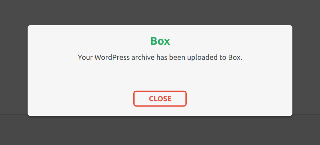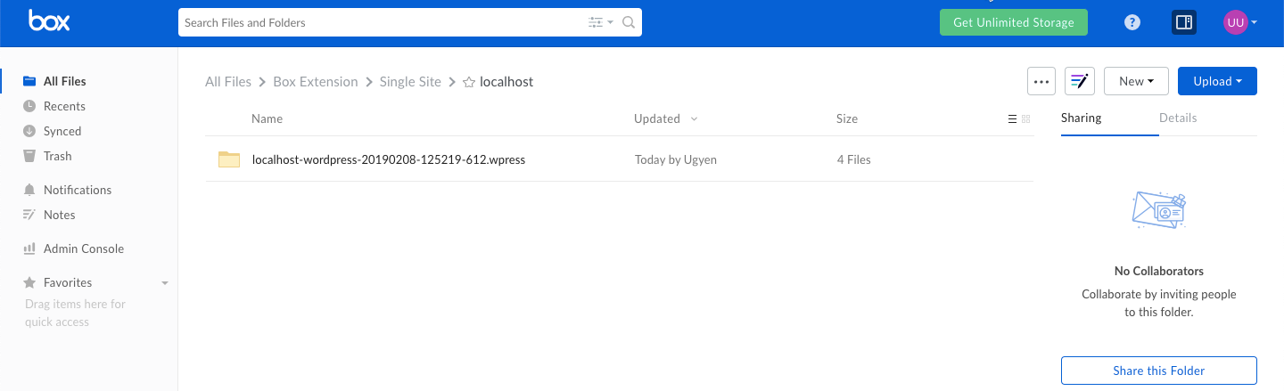 The extension adds a folder called “[your-wordpress-site-name]-wordpress” to your Box account. All of your archives created with the All-in-One WP Migration plugin are saved in that folder. The folder would look something like this, depending on the name of your site: