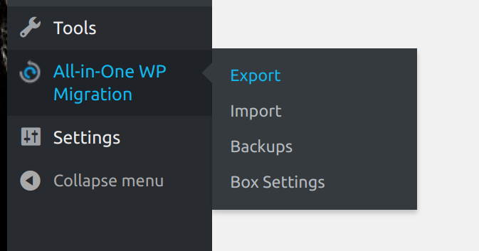 The export process with the Box extension begins by selecting the Export option from the All-in-One WP Migration plugin menu:
