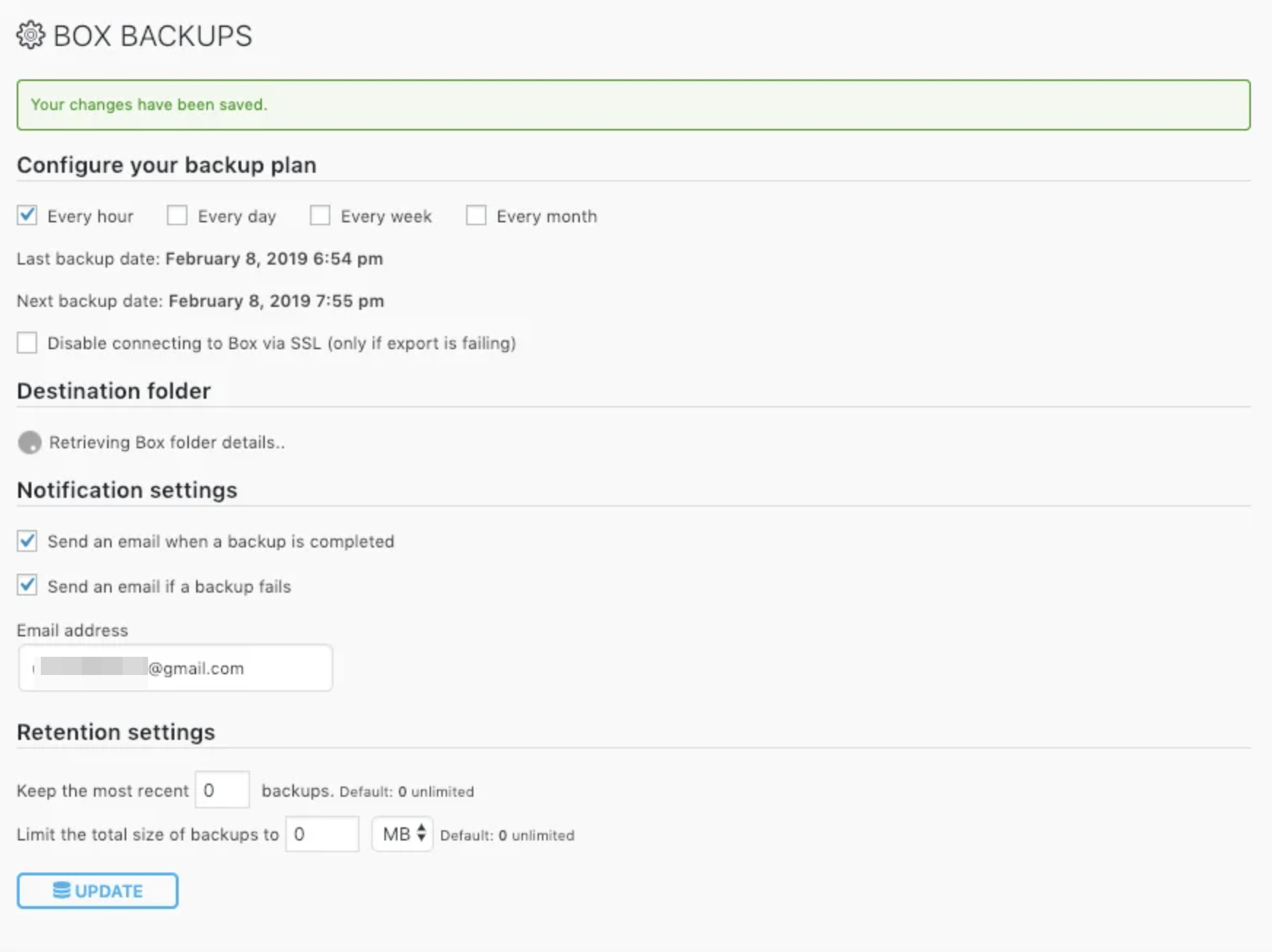 Another option is to specify the number of most recent backups to be kept on your Box cloud storage. In addition, you can specify the total size of backups stored in Box, which is a useful feature if you only have a limited amount of storage space.