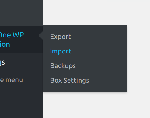 The import procedure begins with the Import option in the All-in-One WP Migration plugin’s menu: