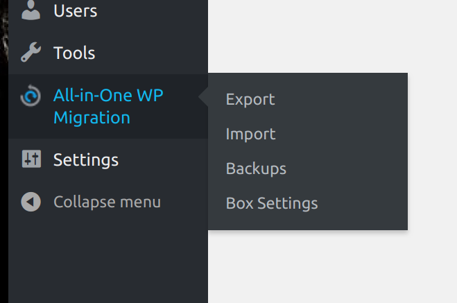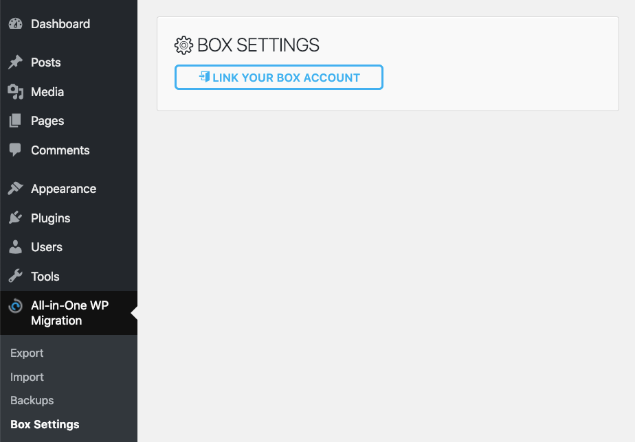Once you successfully install and activate the extension, the Box settings appear in the All-in-One WP Migration plugin’s dropdown: