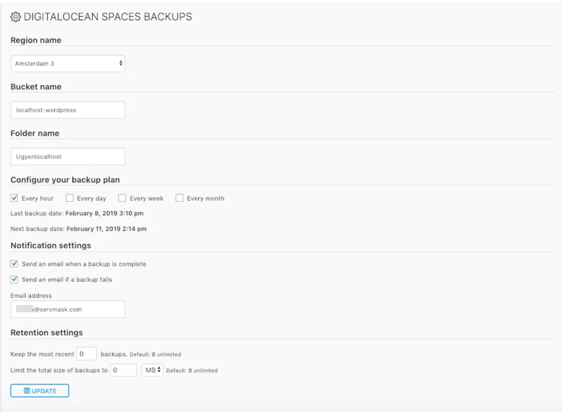 By default, the extension creates a folder in your DigitalOcean Spaces account called “[your-wordpress-site-name]-wordpress.” You can also configure your preferred backup destination folder in your DigitalOcean Spaces account.