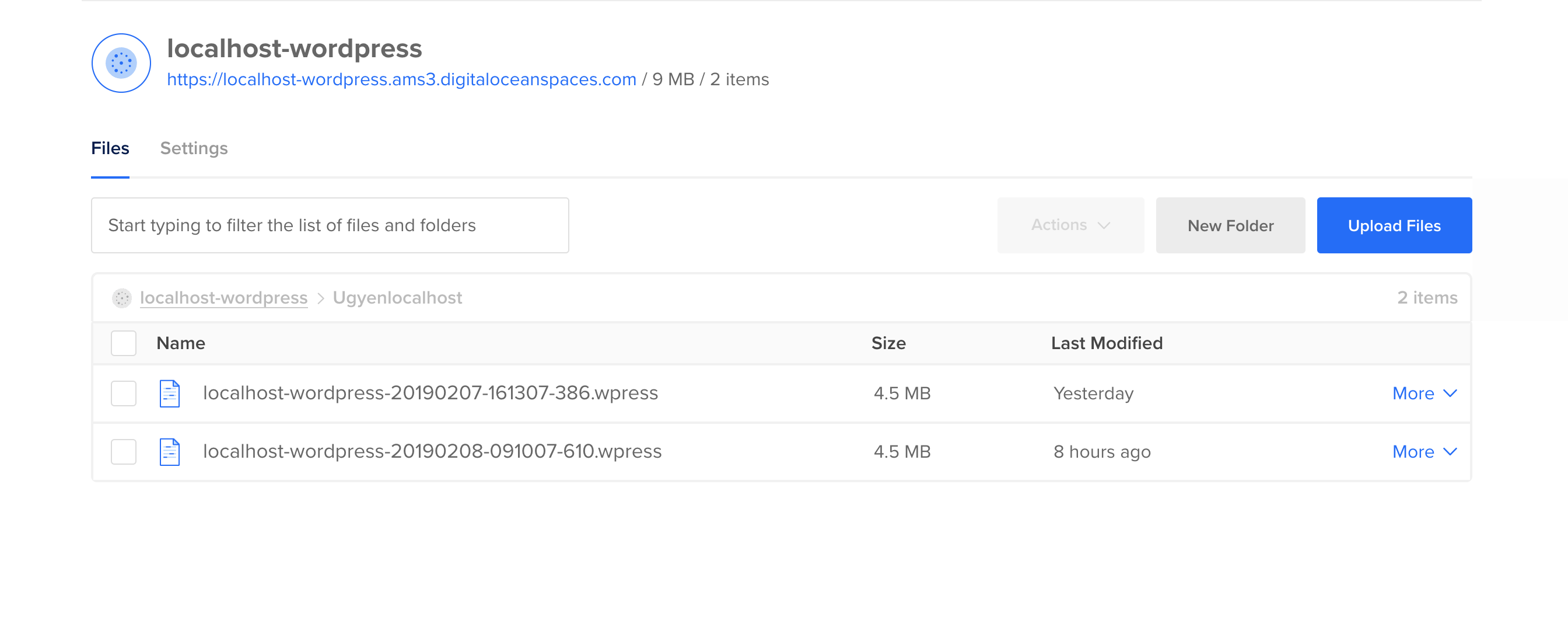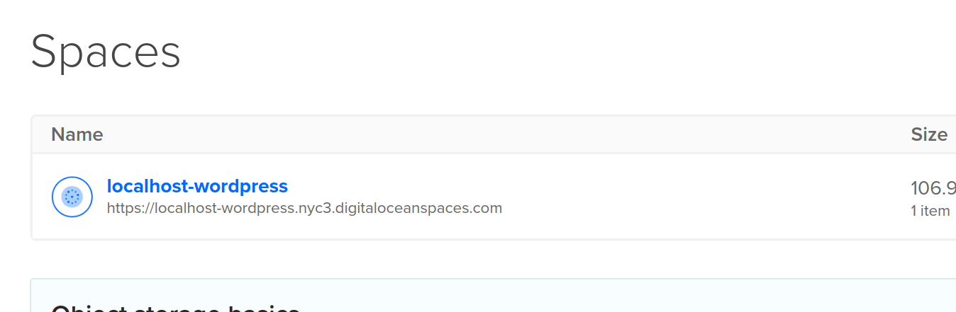 The extension adds a space called “[your-wordpress-site-name]-wordpress” to your DigitalOcean Spaces account. All of your archives created with the All-in-One WP Migration plugin are saved in that location. Depending on the name of your website, the space would look like this: