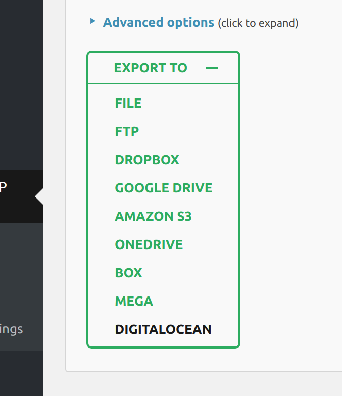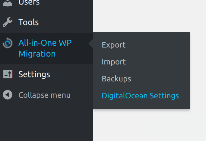 After successfully installing and activating the extension, DigitalOcean Spaces settings appear in the All-in-One WP Migration plugin’s dropdown: