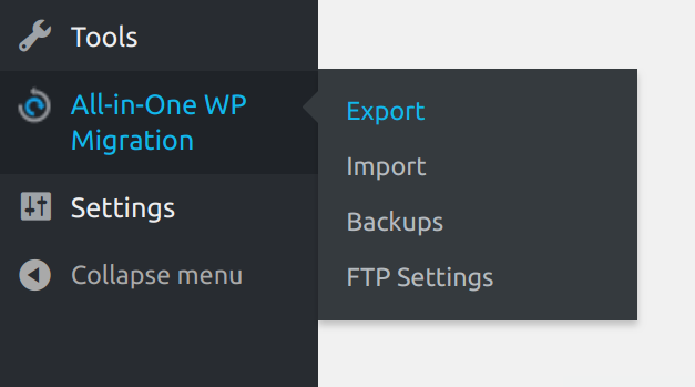 The FTP Extension export process is started by selecting the Export option in the All-in-One WP Migration plugin menu: