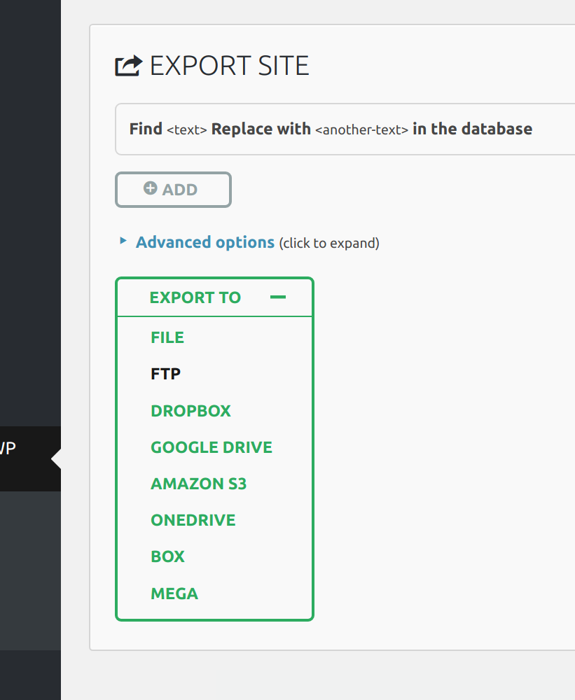 Once you successfully install and activate the extension, the FTP settings appear in the All-in-One WP Migration plugin’s dropdown: