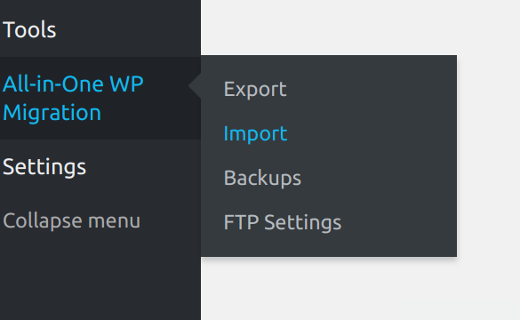 The import procedure begins by selecting the Import option from the All-in-One WP Migration plugin menu: