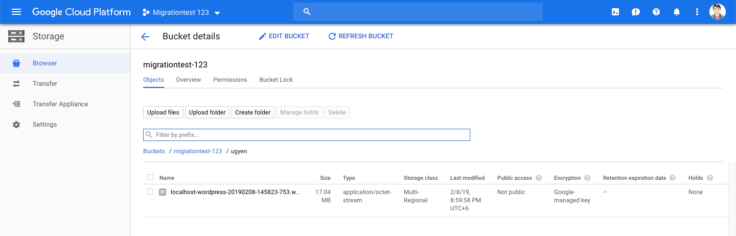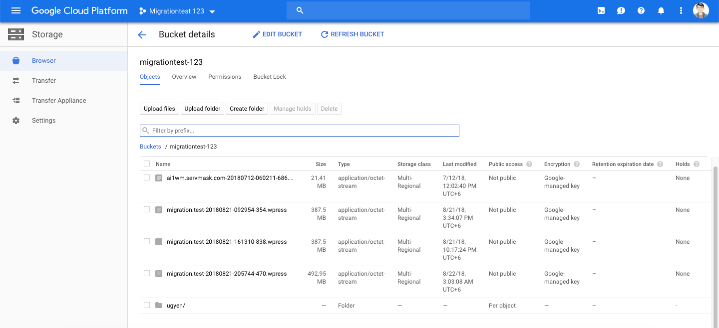 The extension creates a project and a bucket inside your Google Cloud Storage account named ‘[your-wordpress-site-name]-wordpress’. Inside that bucket, all your archives are created and stored using the All-in-One WP Migration plugin. Depending on your site name, the folder would look like this:
