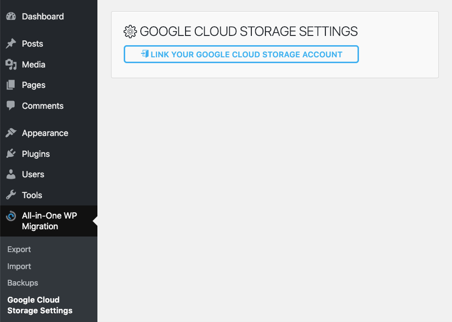 Once you successfully install and activate the extension successfully, the Google Cloud Storage settings appear in the dropdown of the All-in-One WP Migration plugin in WordPress.