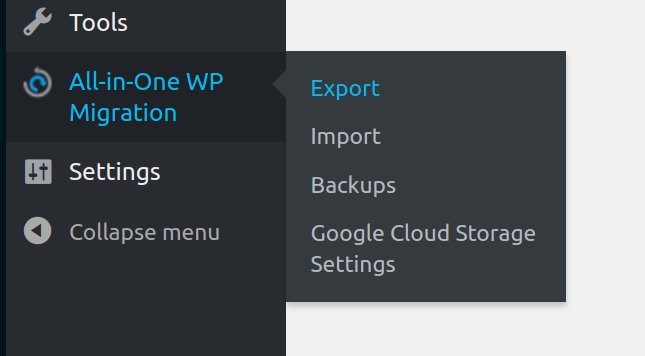 You can initiate the export process using Google Cloud Storage extension from the Export option in the All-in-One WP Migration plugin menu: