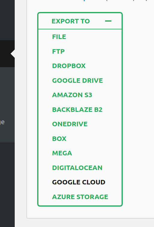 After successfully installing and activating the extension, the Google Cloud Storage settings appear in the All-in-One WP Migration plugin’s dropdown.