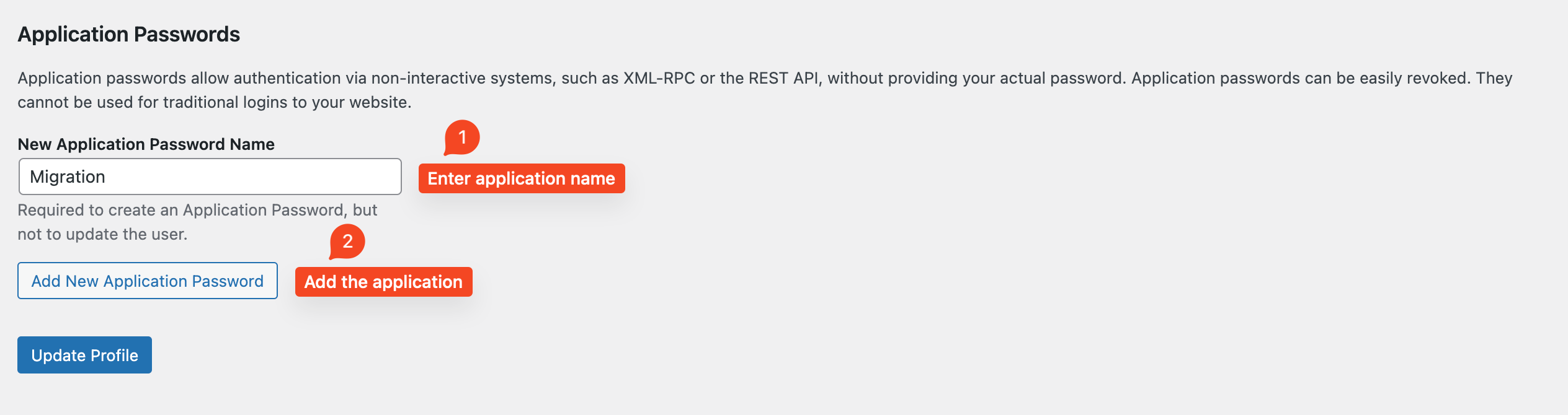 On the “Edit” page, scroll down to the “Application Passwords” section. Here you will need to enter a name for the Application Password, then click on the “Add New Application Password” button below to create the password