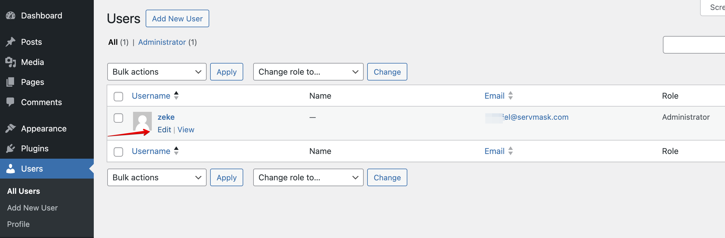 Next, locate the particular user you want to generate the Application Password for and click on “Edit”
