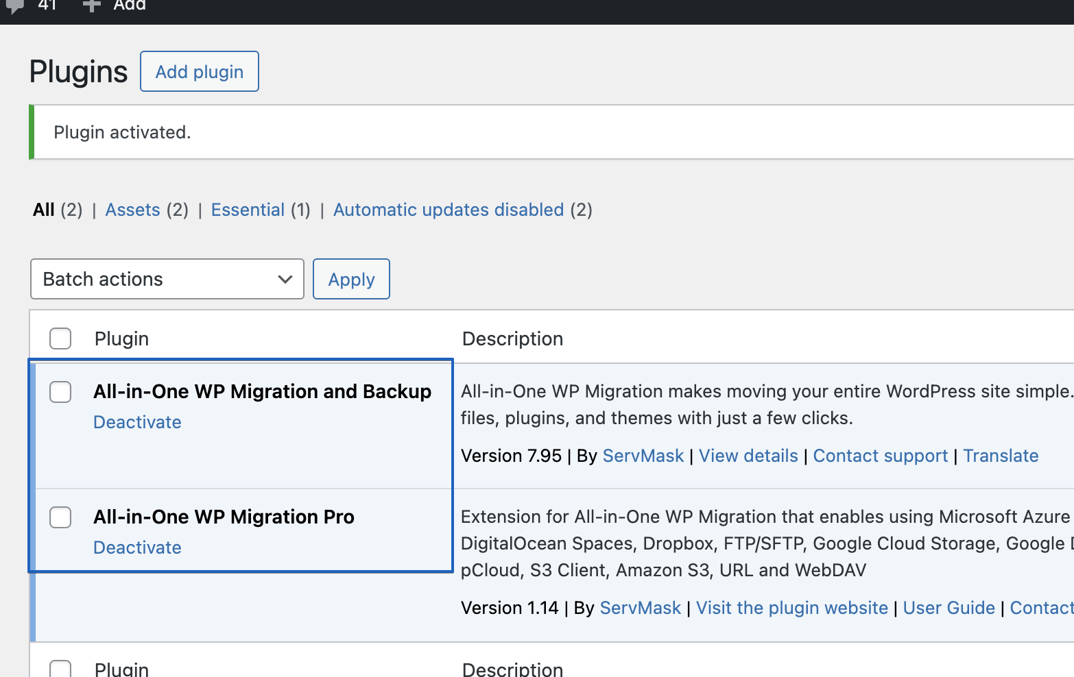 11. You will receive a notification stating, “Plugin activated.” Both the free version of the plugin and All-in-One WP Migration Pro will appear in your plugin list.