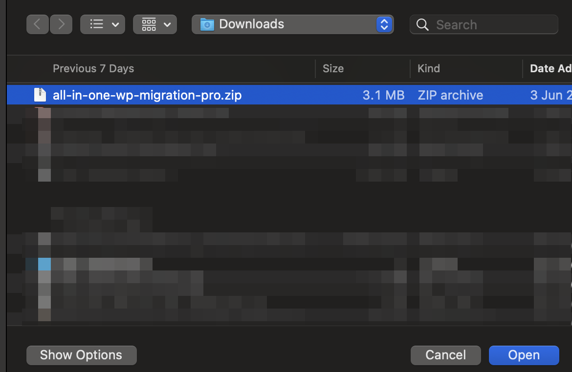 8. Navigate to the folder where the extension was saved. Click “Open” after selecting the “all-in-one-wp-migration-unlimited-extension.zip” file.