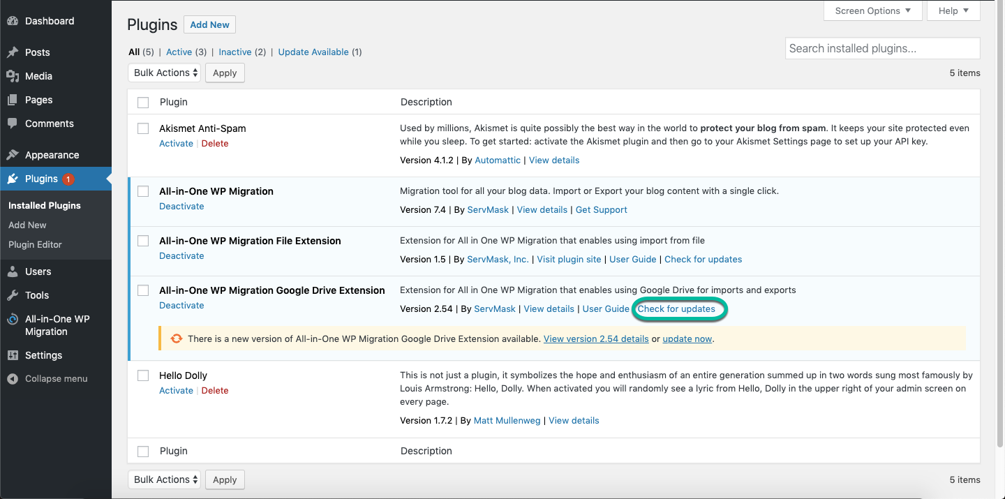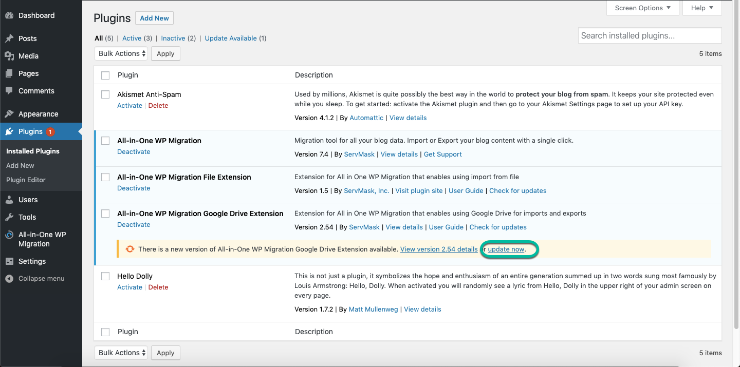 - If there is an update to the latest version, you may see a message that says “There is a new version of All-in-One WP Migration Google Drive Extension available.”