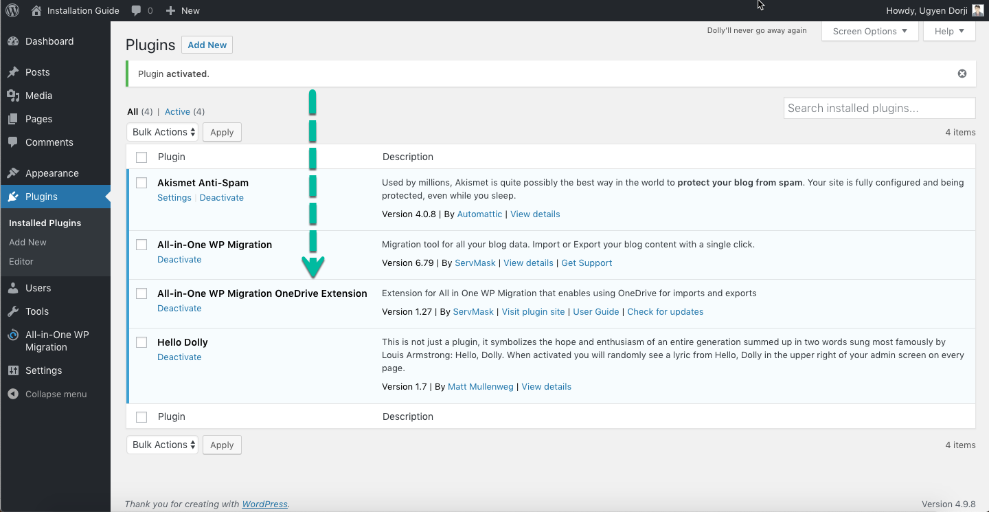 - You will get a notification that states, “Plugin activated.” You will see the new plugin in your list of plugins.
