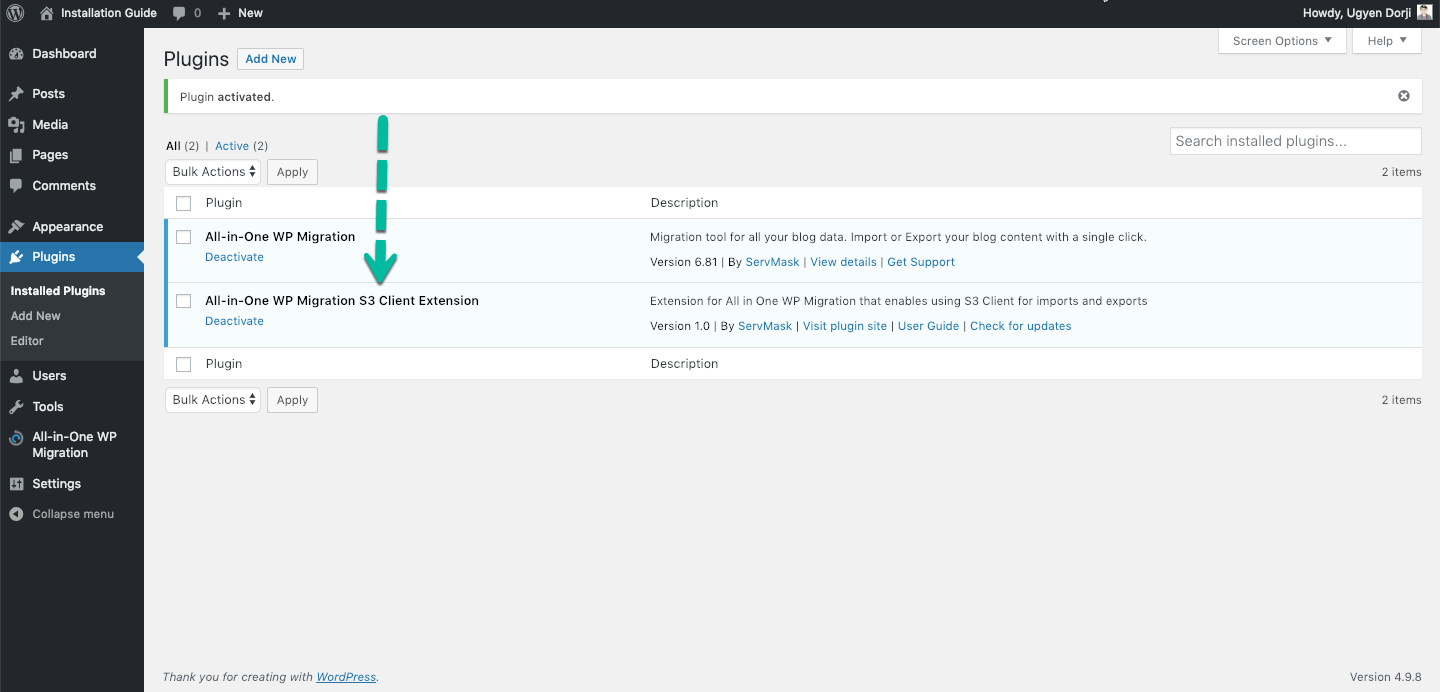 - You will get a notification that states, “Plugin activated.” You will see the new plugin in your list of plugins.
