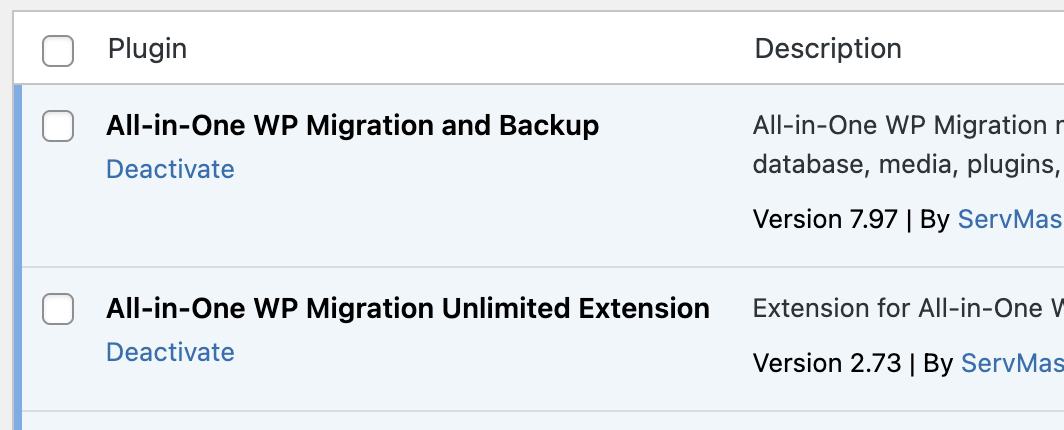 - You will receive a notification stating, “Plugin activated.” The new plugin will appear in your plugin list. Also, the “All-in-One WP Migration plugin will be automatically installed with the Unlimited Extension.