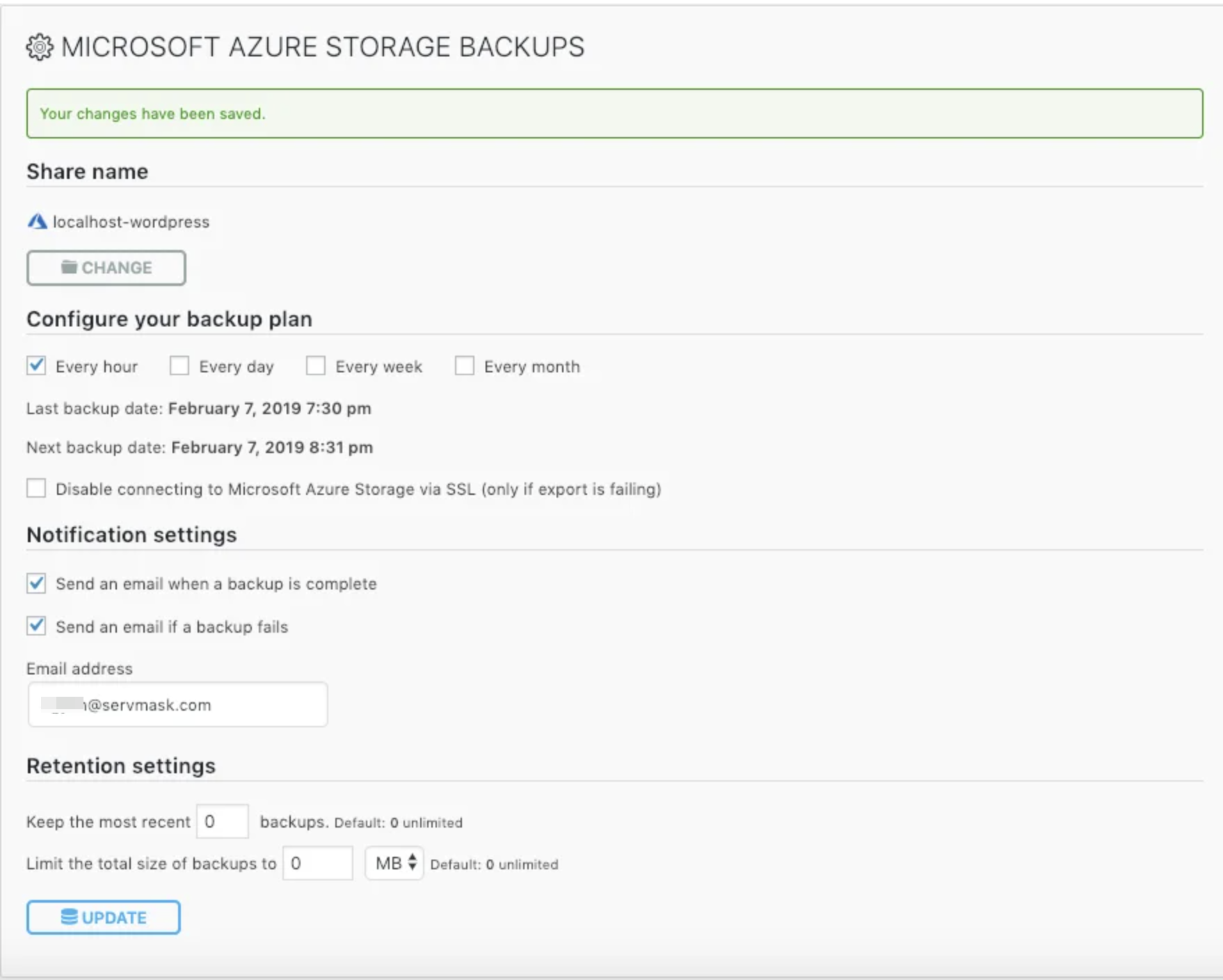 You can specify the number of backups that you want to keep on your Microsoft Azure storage as well as the total size of backups that you want to keep on your server – this is a very useful option if you only have a limited amount of storage space.