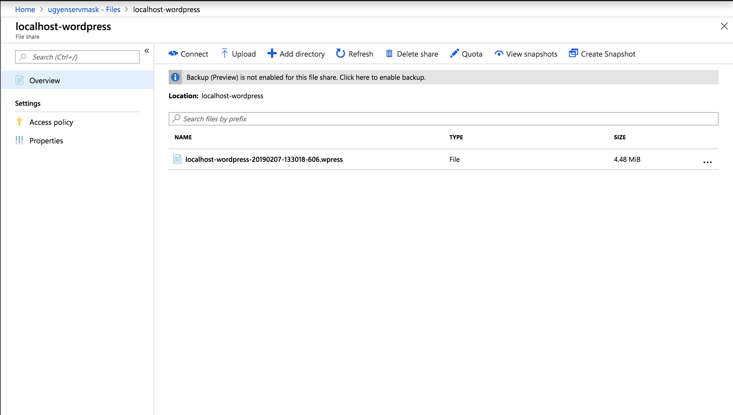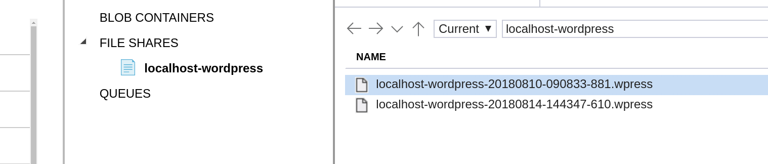 The extension creates a project and a bucket called “[your-wordpress-site-name]-wordpress” in your Microsoft Azure Storage account. Using the All-in-One WP Migration plugin, all of your archives create and store within that bucket. The folder would look something like this, depending on the name of your site:
