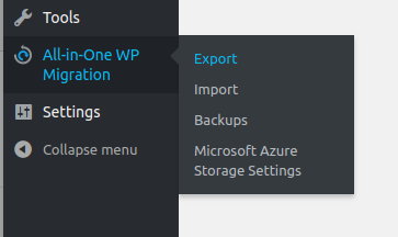 You can start the export process with the Microsoft Azure Storage extension by selecting Export from the All-in-One WP Migration plugin menu: