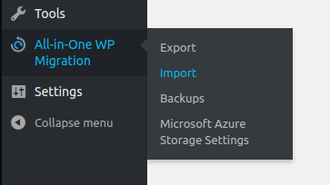 You can begin the import process by selecting Import from the All-in-One WP Migration plugin menu: