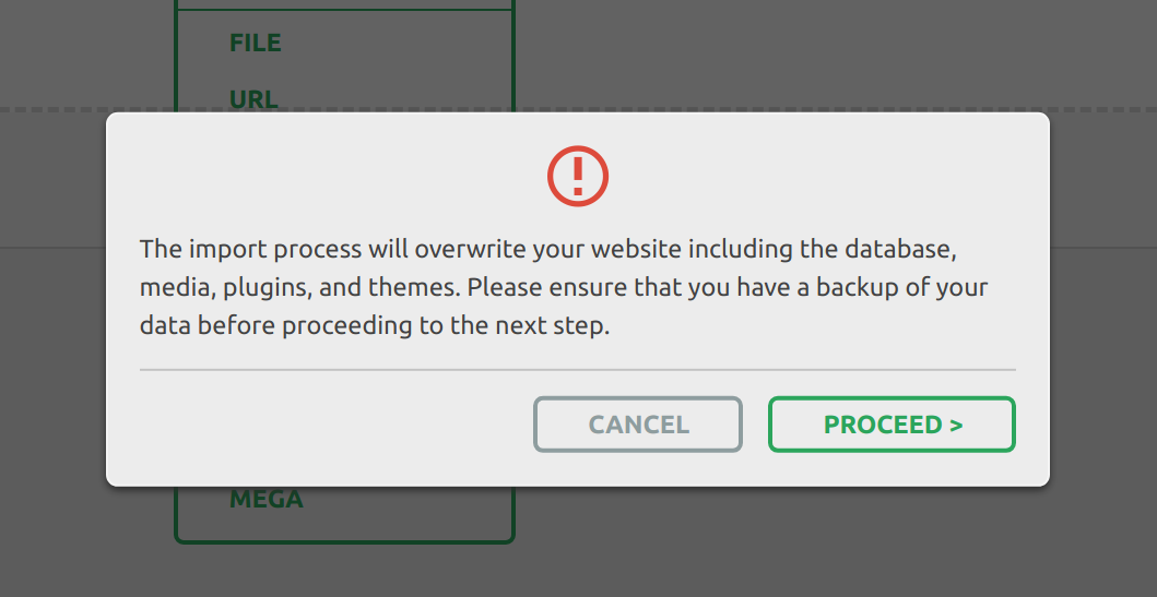 The Import process includes an additional step that warns you that the new backup will overwrite your website’s database, media, plugins, and themes. This is the final step in the process, and you can cancel it at any time. You can no longer pause the import process after clicking “Proceed.”