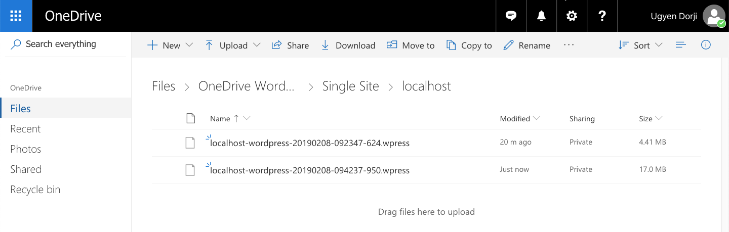 The extension creates a folder called “[your-wordpress-site-name]-wordpress” in your OneDrive account. All of your archives created with the All-in-One WP Migration plugin are saved in that folder. The folder would look something like this, depending on the name of your site: