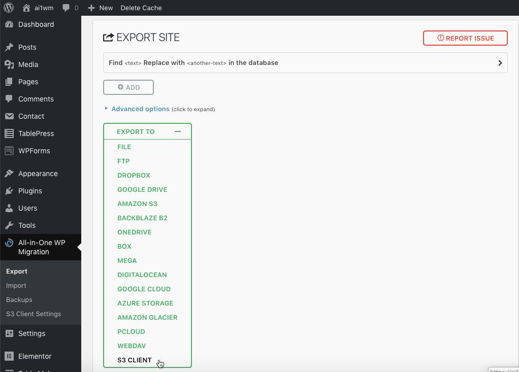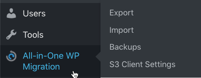 The S3 Client settings page appears in the All-in-One WP Migration plugin’s list of pages. Following the installation and successful activation of the extension: