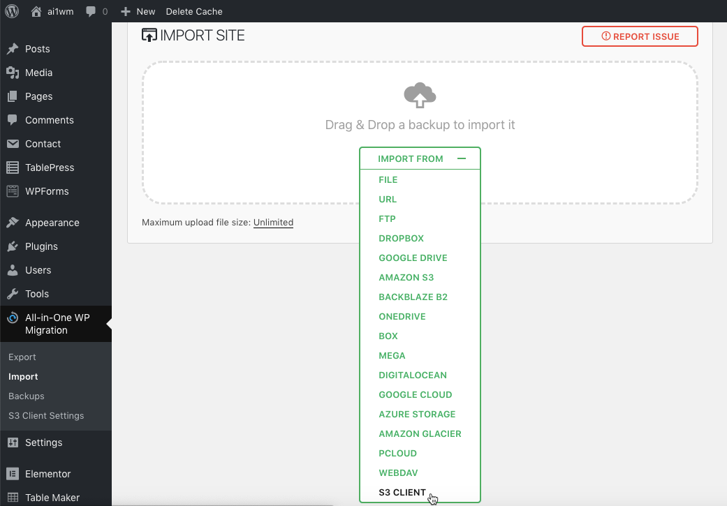 After installation and activation, the S3 Client settings appear in the All-in-One WP Migration plugin dropdown: