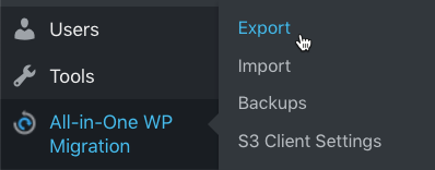 The S3 Client extension export process starts by selecting the Export option in the All-in-One WP Migration plugin menu: