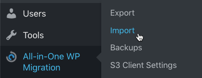 The import procedure begins with the Import option in the All-in-One WP Migration plugin’s menu:
