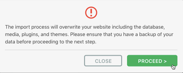 The Import process includes an extra step that warns you that the new backup will overwrite your website’s database, media, plugins, and themes. This is the final step in which you can cancel the process. After clicking “Proceed,” you will be unable to halt the import process.