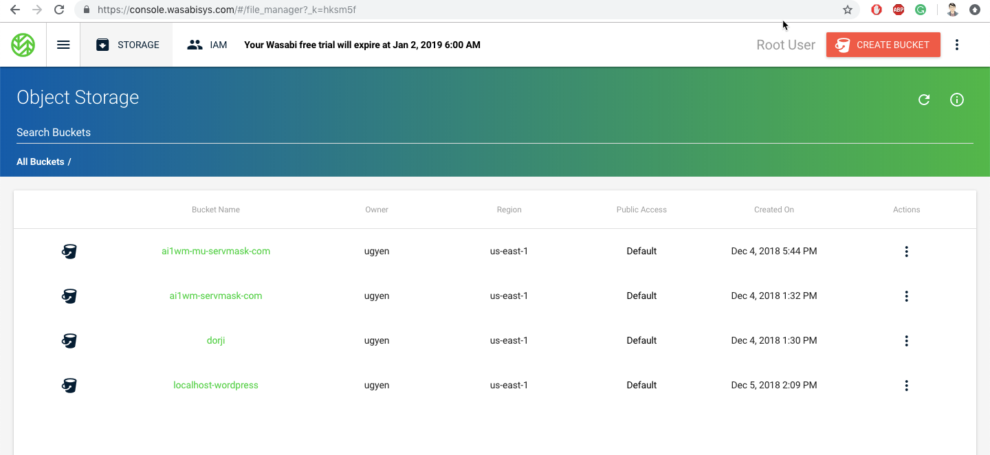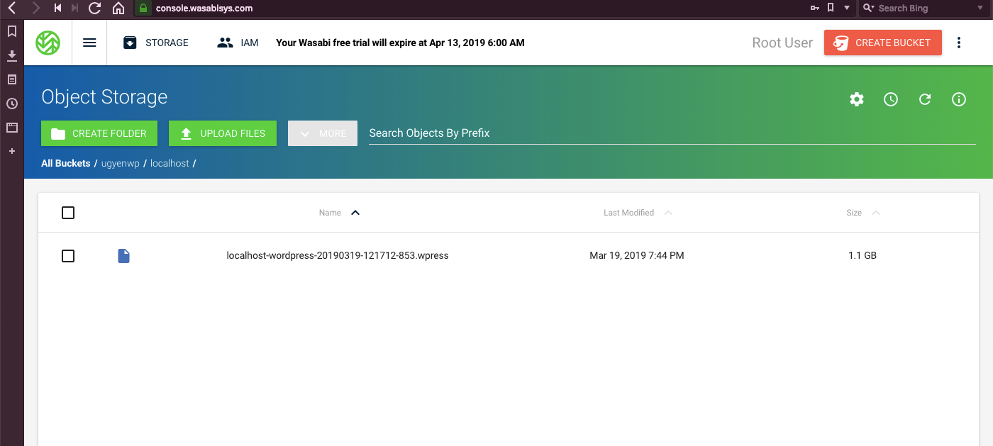 The extension creates a bucket in your S3 Compatible Cloud Storage providers account named “[your-wordpress-site-name]-wordpress.” All of your archives created with the All-in-One WP Migration plugin are saved in that bucket. Depending on the name of your site, the bucket might look like this: