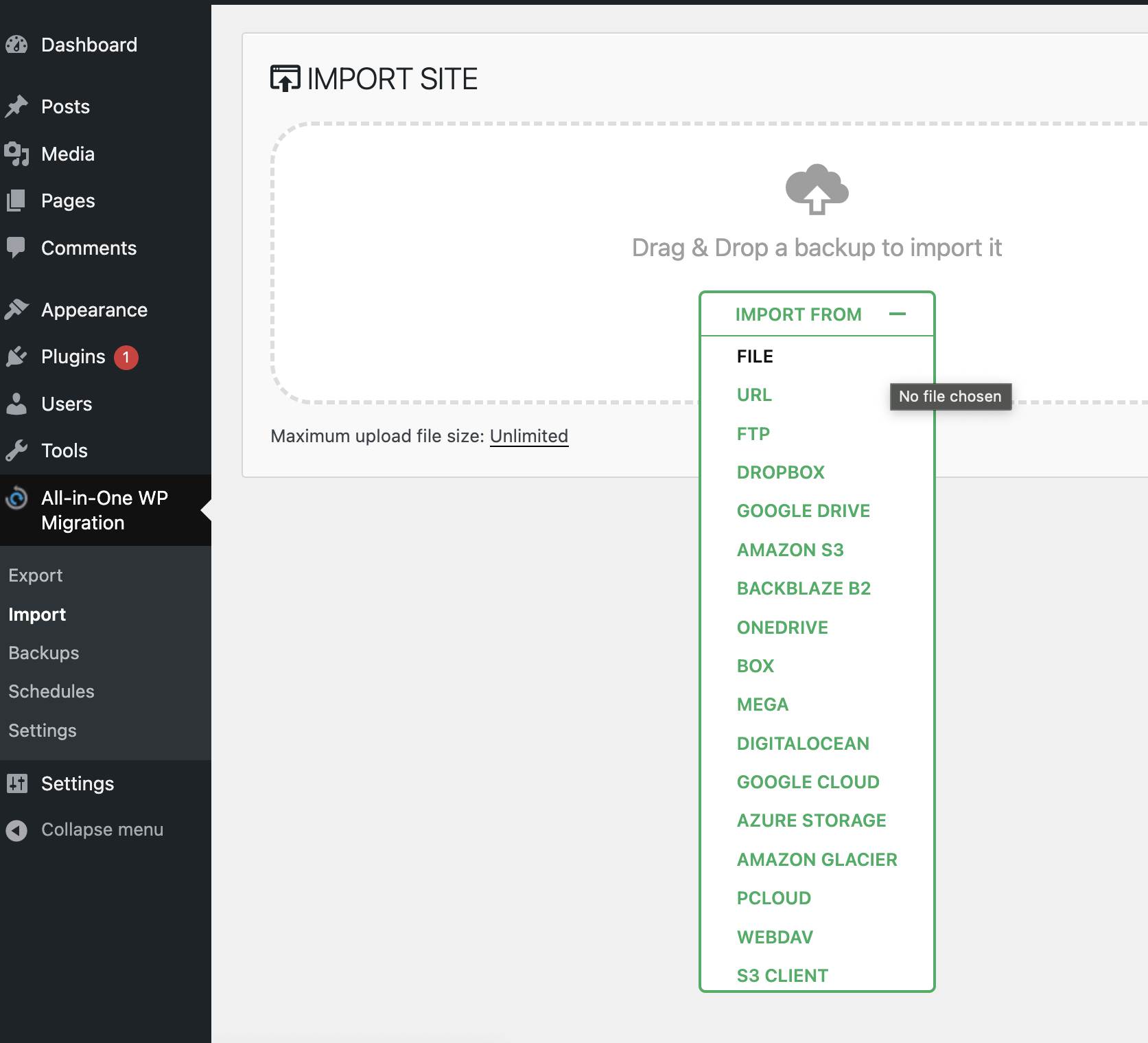 The Unlimited Extension adds to the functionality of the All-in-One WP Migration plugin by allowing you to import large backups regardless of your hosting provider’s upload limitations. The tool can be used in conjunction with any other All-in-One WP Migration plugin extensions to facilitate the direct import of your websites/network of sites from your cloud/storage.