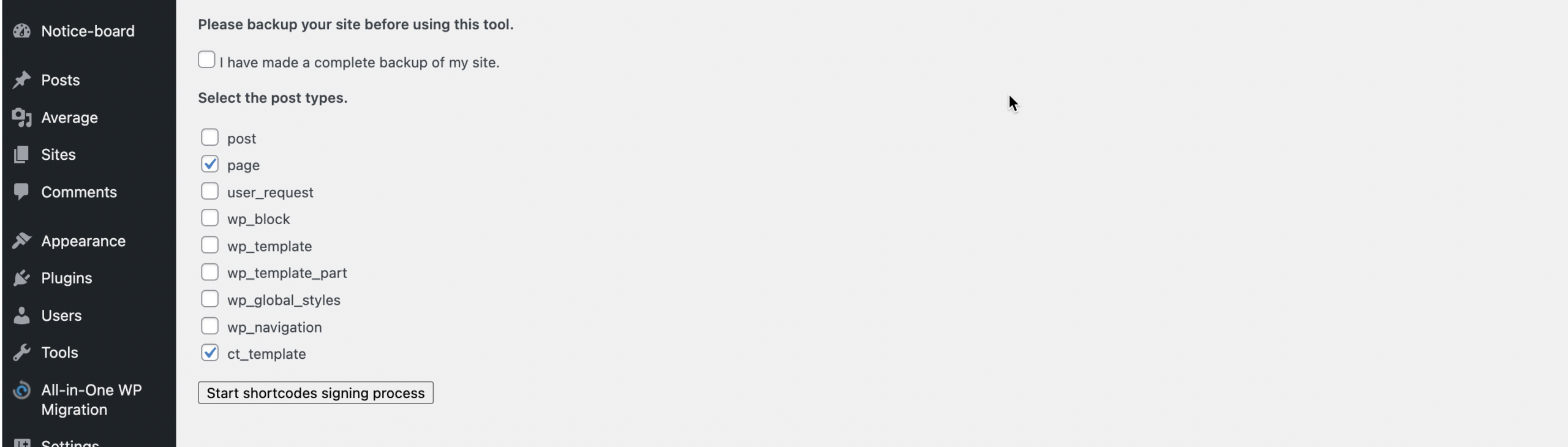 - On the next page, first check off that you have made a complete backup of the site, and then select the post types that you would like to resign shortcodes for.