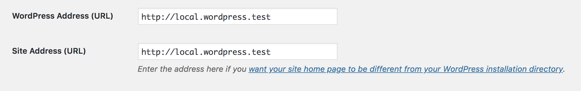 1. Go to Settings > General in your WordPress Dashboard and enter http://local.wordpress.test in the following fields.