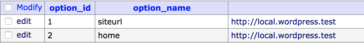 3.In your database, navigate to wp options and ensure that siteurl and home are both set to your current site URL. (http://local.wordpress.test).